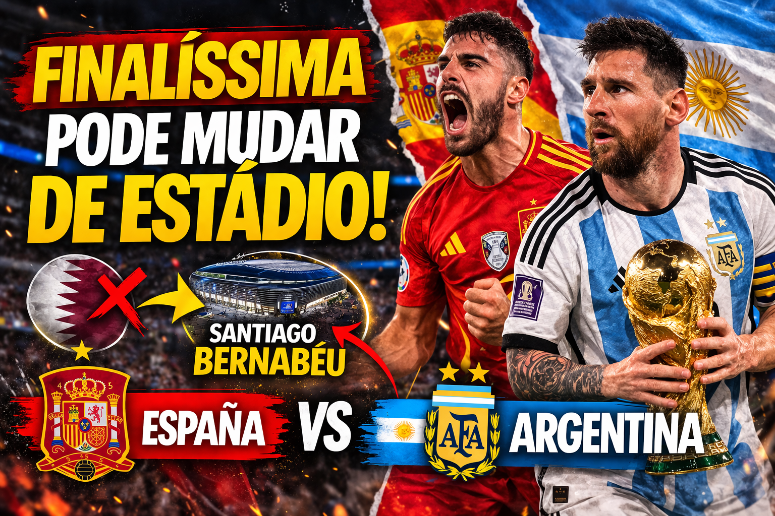 A aguardada Finalíssima entre Seleção da Espanha e Seleção Argentina pode ter o local da partida alterado nos próximos dias. A organização do evento estuda retirar o jogo do Catar por questões de segurança internacional e transferi-lo para o estádio Santiago Bernabéu, em Madri. A possível mudança tem gerado discussões entre dirigentes e federações envolvidas na realização do confronto.